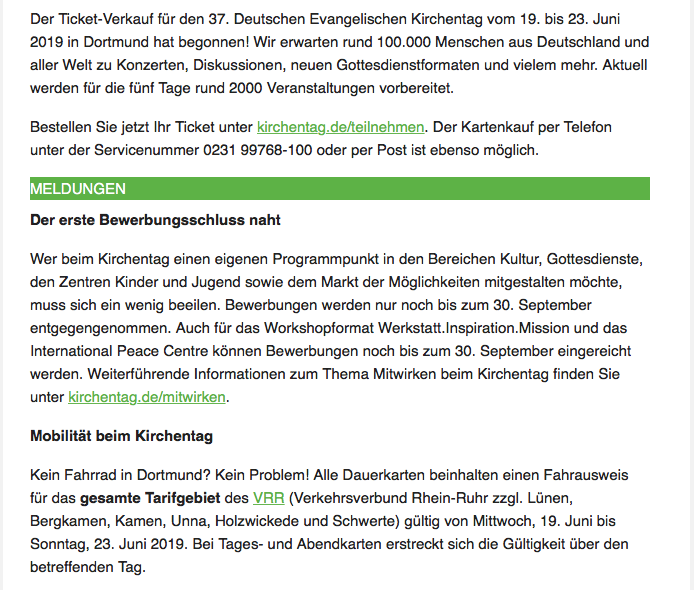 Deutscher Evangelischer Kirchentag 2019 Veröffentlicht am 19. Juni 201924. September 2018 Karte nicht verfügbar Datum / Uhrzeit 19.06.2019 - 23.06.2019Ganztägig Kategorie Allgemein Diskutieren, feiern, entdecken, tanzen, gemeinsam Glauben erfahren – erleben Sie den Kirchentag in Dortmund. Foto: Kathrin Erbe