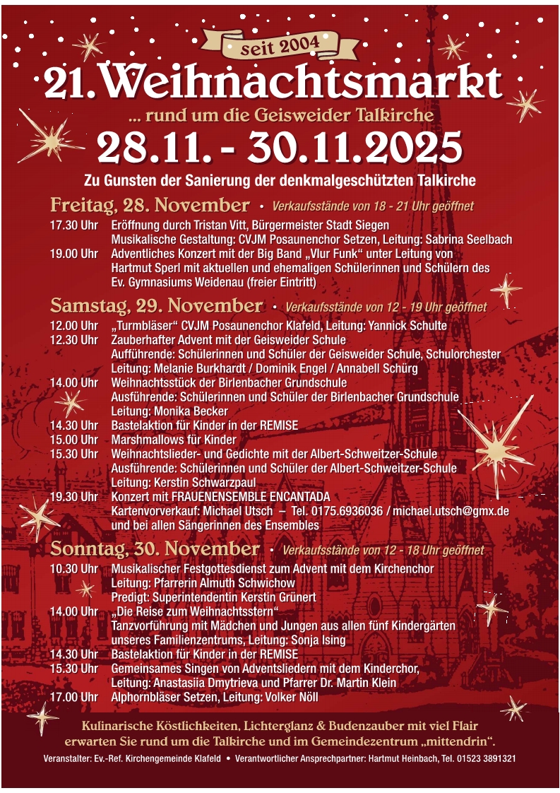 Weihnachtsmarkt „Rund um die Talkirche“ 2025 Veröffentlicht am 28. November 202520. November 2025 Lade Karte ... TalkircheKoomansstraße 8 - SiegenDetails 50.91537 8.00945999999999 Datum / Uhrzeit 28.11.2025 - 30.11.2025Ganztägig Ort Talkirche Kategorie Allgemein Gottesdienst Talkirche