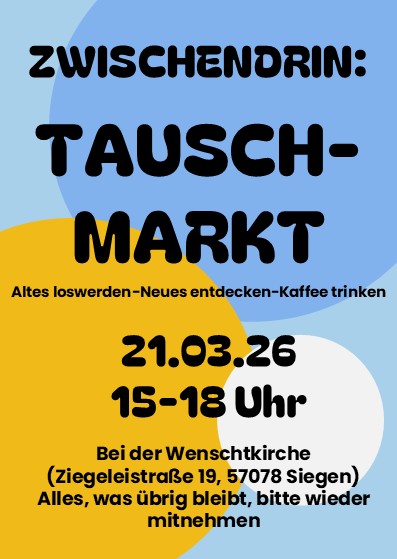 ZWISCHENDRIN – Tauschmarkt am 21.03.2026 Veröffentlicht am 21. März 202627. Februar 2026 Karte nicht verfügbar Datum / Uhrzeit 21.03.202615:00 - 18:00 Ort Gemeindezentrum Wenscht Kategorie Allgemein